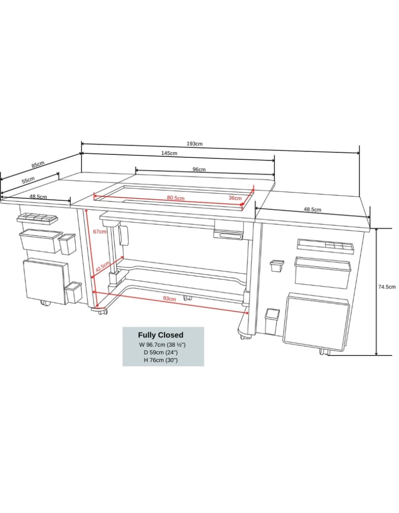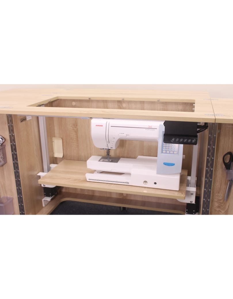 This cabinet is fitted with a super-maxi sized opening and is able to take the very largest of products such as the Brother XV, XJ1, Luminaire, Stellaire, Aveneer. Janome Horizon 15000, Continental M7, M8 & M17. Bernina 8 series & new 990, Viking/Husqvarna Epics. Pfaff Ikons etc and other brands with extra-large products not mentioned above.