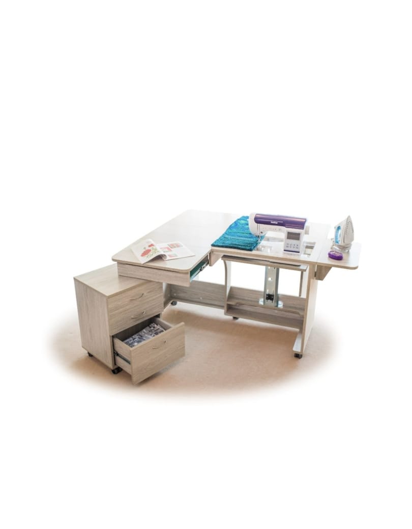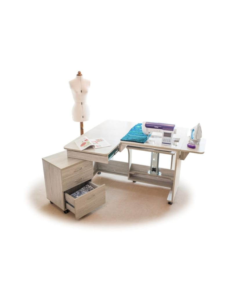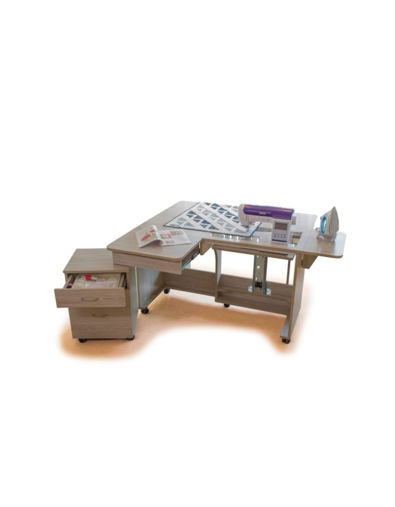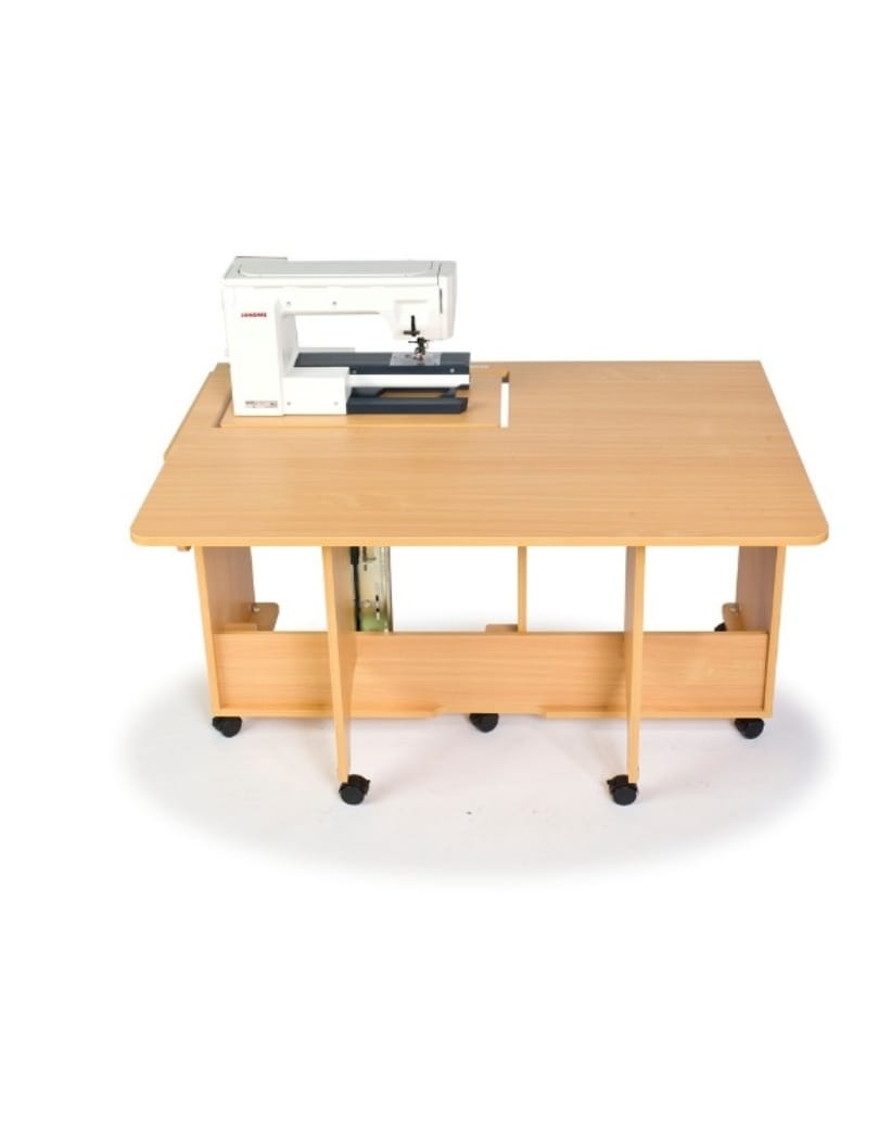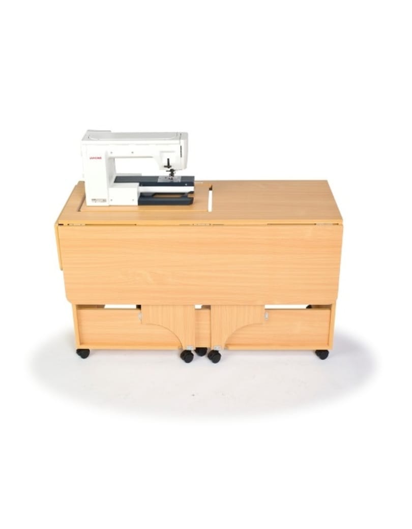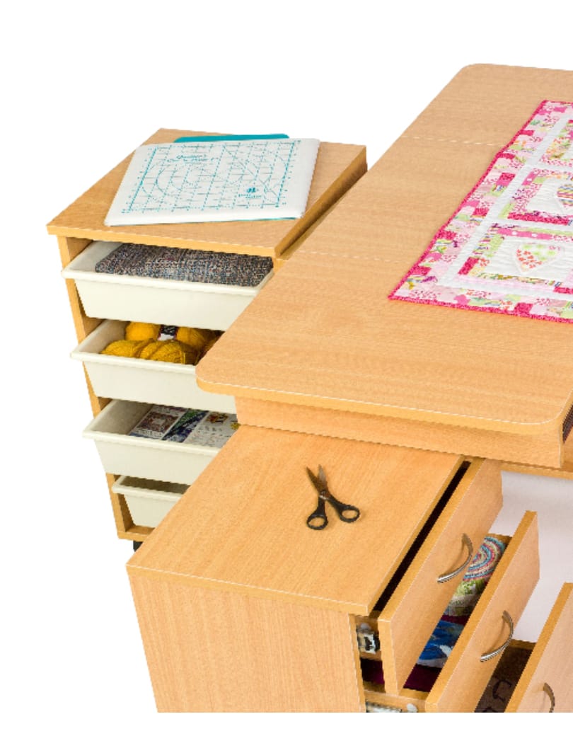 The Horn Quilters Delight Mk2 has a large working area positioned all around the cabinet which is able to support even the largest projects not only that there is also a handy mobile set of drawers which when stored sits tidily inside the main table, so reducing its floor space, but when pulled out it can be moved on its castors in relation to where's best for you. On the back of the Quilter's Delight Mk2 is a large foldable work area. The large foldable work area is ideal for supporting larger items like quilts and curtains while sewing and this area can also be used as a cutting area when the machine is not in use.