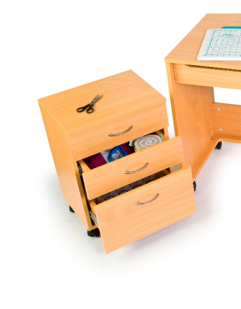 Included - there’s a handy mobile set of drawers which when stored sits tidily inside the main table, so reducing its floor space, but when pulled out it can be moved on its castors in relation to where’s best for you.