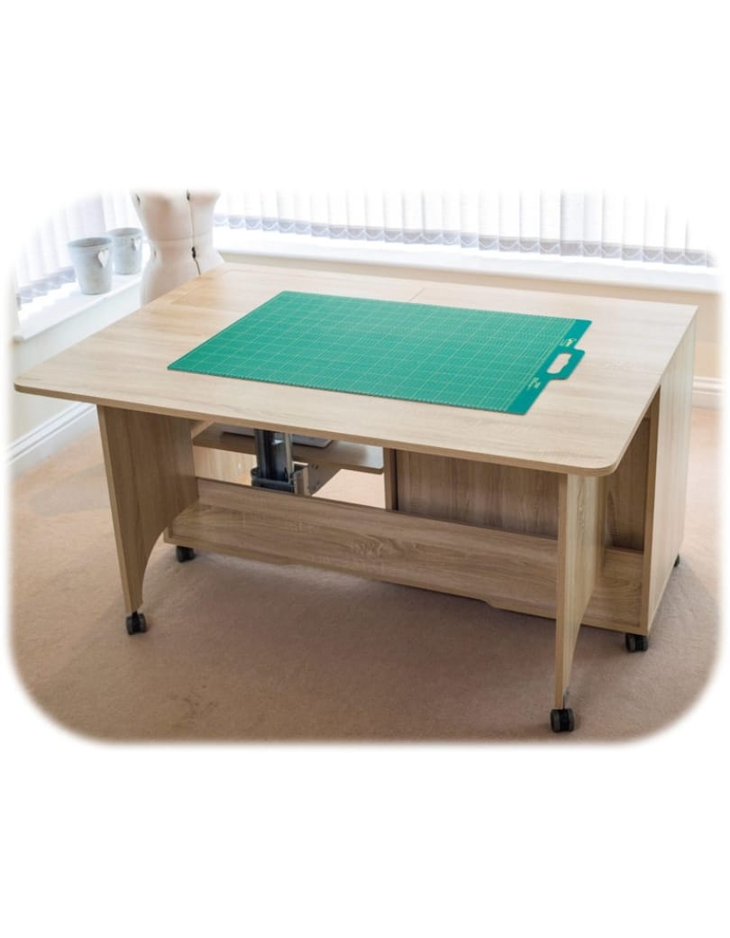 - A huge work area at the back of the machine which prevents the needle drag that can happen with large projects. It which lifts up easily when needed and down when not (so it doesn’t have to be open all the time). It has a very sturdy gate leg design with Quilters/ Patchworkers in mind but is ideal for all sewing projects.