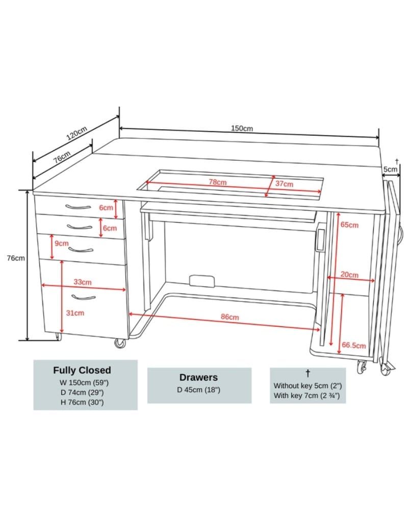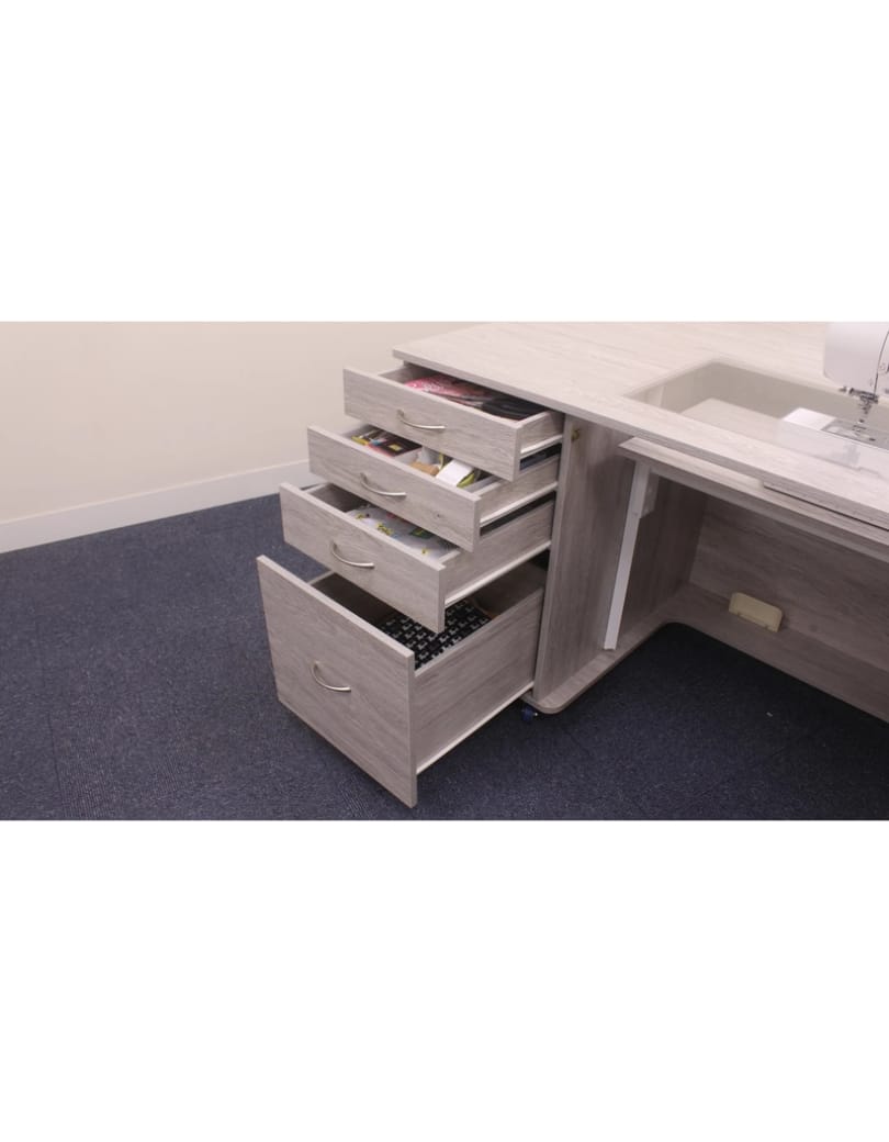 - Deep integrated drawers can store accessories, notions and fabric.
