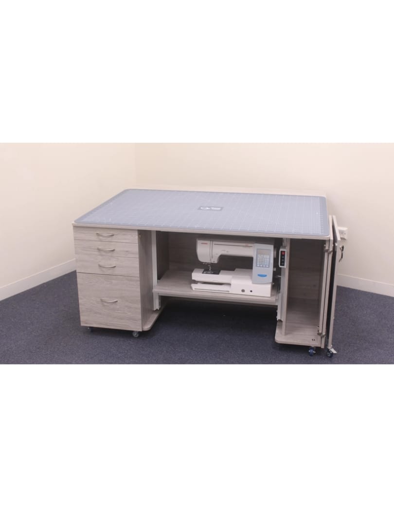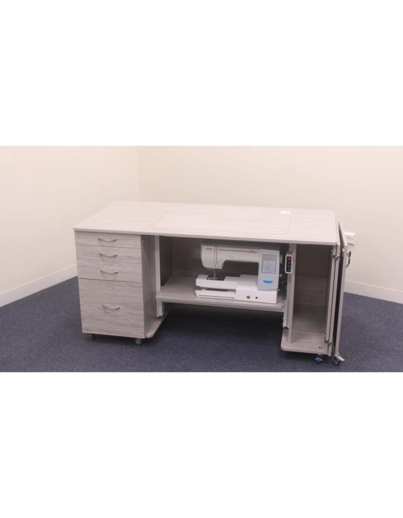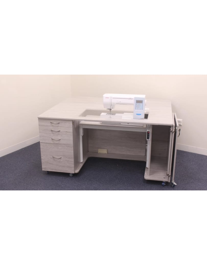 This unit is a versatile powerhouse in our Electric range, featuring a new electric lift, expansive workspace, and generous storage for accessories, fabric, and embroidery hoops.